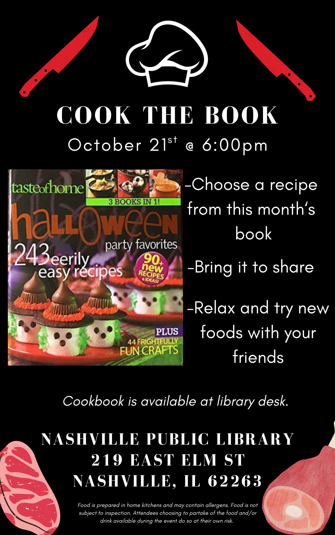 Cookbook program at library on October 21st at 6pm. Choose a recipe from the book, make it and bring it to share.